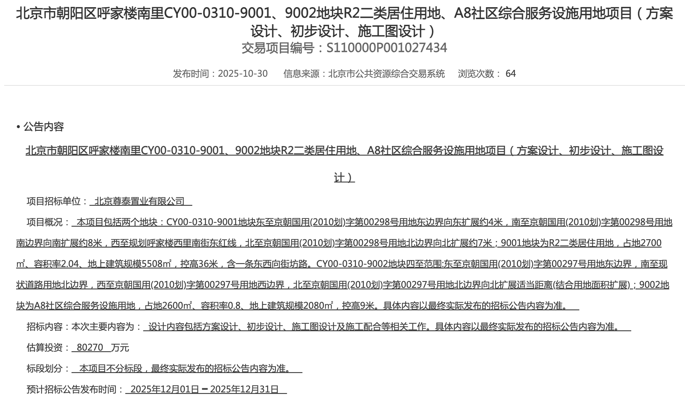 北京进深 徐迪拿地近两个月,首开呼家楼南里地块发出了设计招标计划。