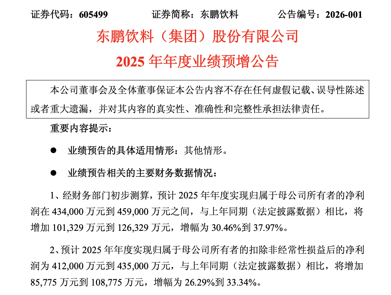 1月13日,东鹏饮料发布2025年年度业绩预增公告。经财务部门初步测算,预计2025年年度实现归属于母公司所有者的净利润在43.4亿元到45.9亿元之间,与上年同期(法定披露数据)相比,增幅为30.46%到37.97%。