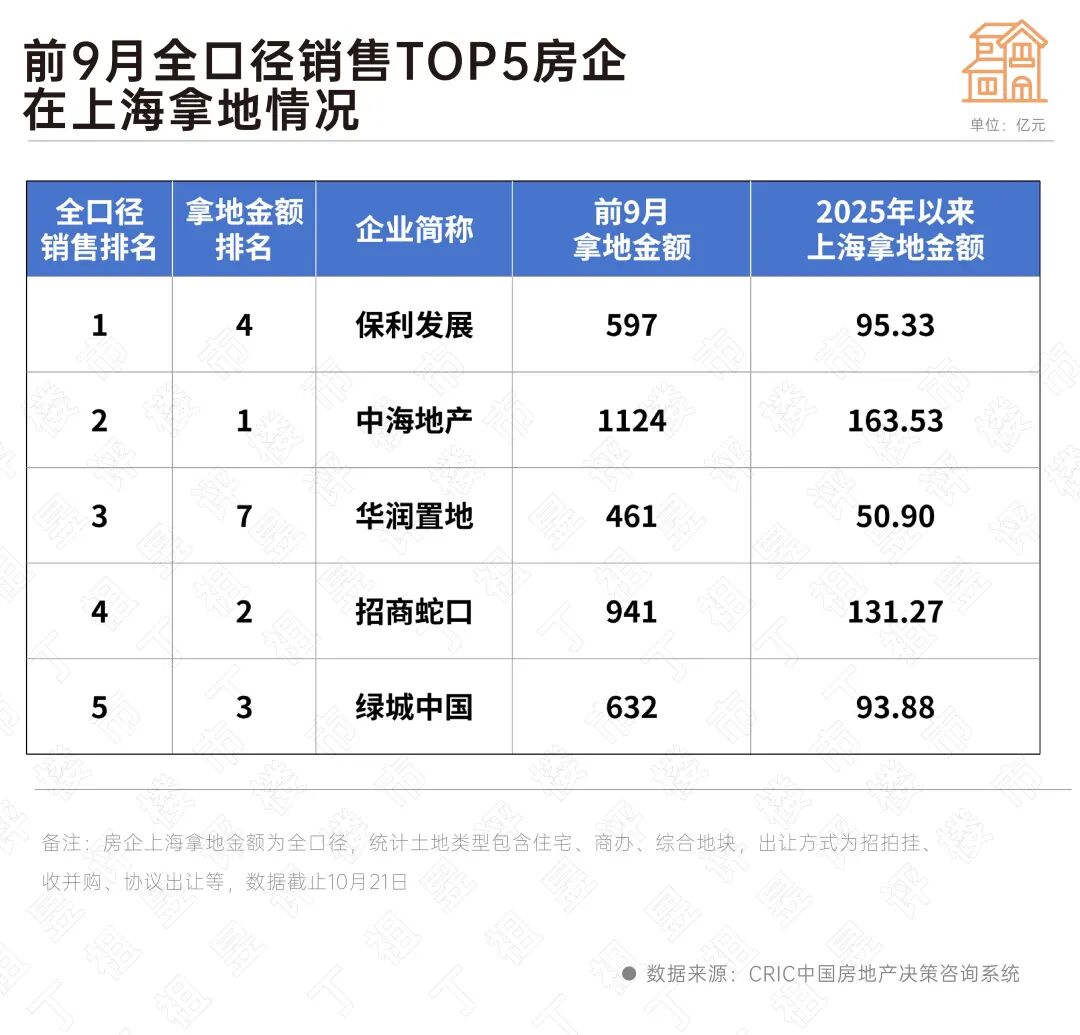 比如1-9月全口径销售TOP5房企保利发展、中海地产、华润置地、招商蛇口、绿城中国累计拿地金额同比涨幅均超过70%。
