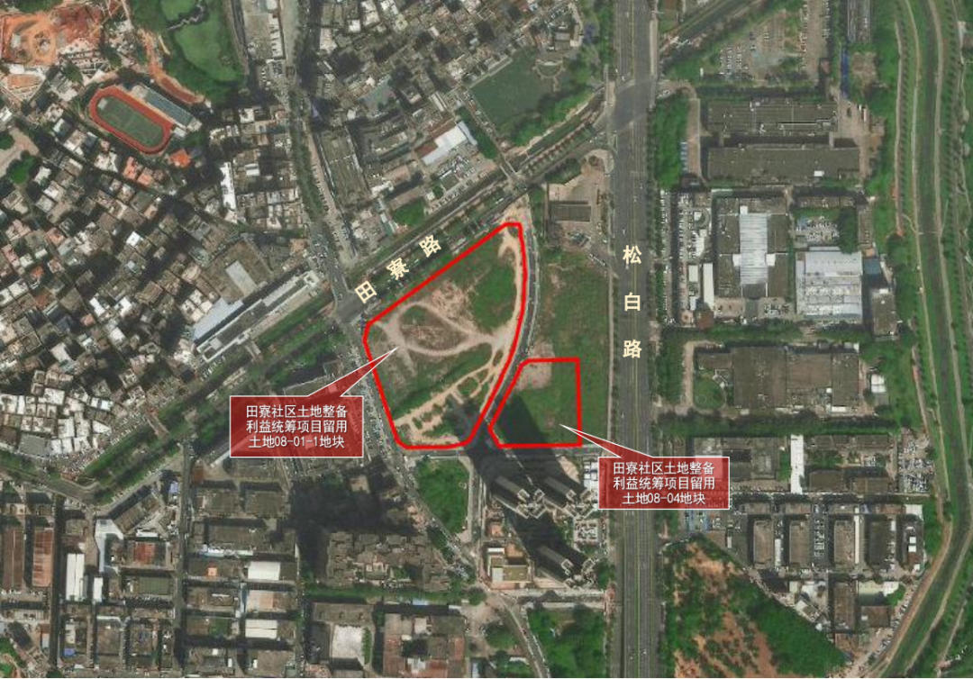 田寮社区土地整备利益统筹项目,位于光明区玉塘街道,松白路与田寮路交汇处。