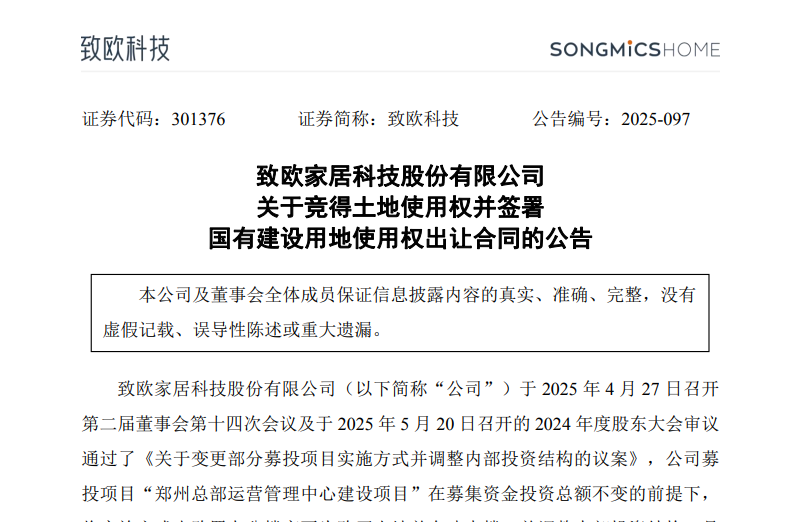 据致欧科技(301376.SZ)公告,公司以总地价5094万元竞得了编号为郑政出〔2025〕26号(网)地块的国有建设用地使用权。