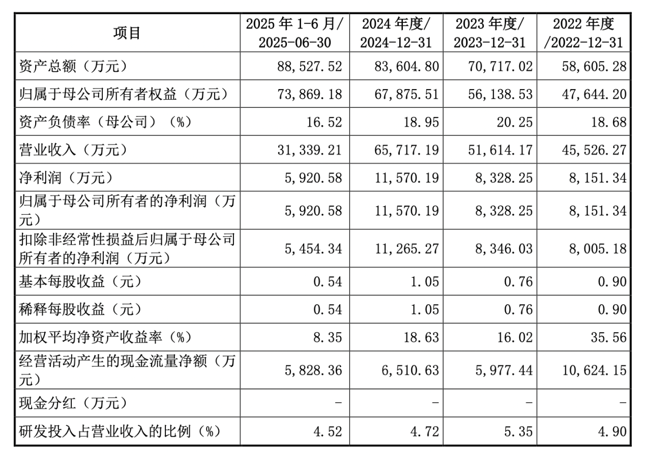 据招股书,2022年-2024年及2025上半年,新广益实现营收分别为4.55亿元、5.16亿元、6.57亿元、3.13亿元;归母净利润分别为8151.34万元、8328.25万元、1.16亿元、5920.58万元。