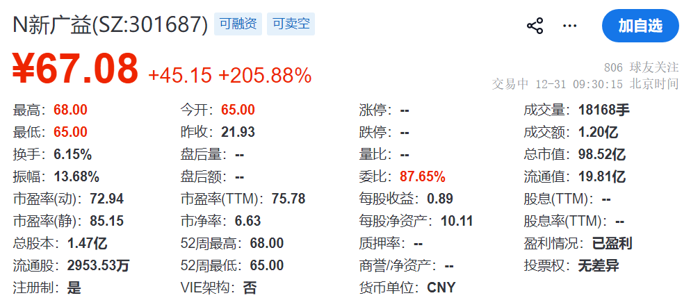 乐居财经 王敏 12月31日,N新广益(SZ:301687)在创业板挂牌上市,保荐机构为中信证券,其开盘涨205.88%,总市值98.5亿元。