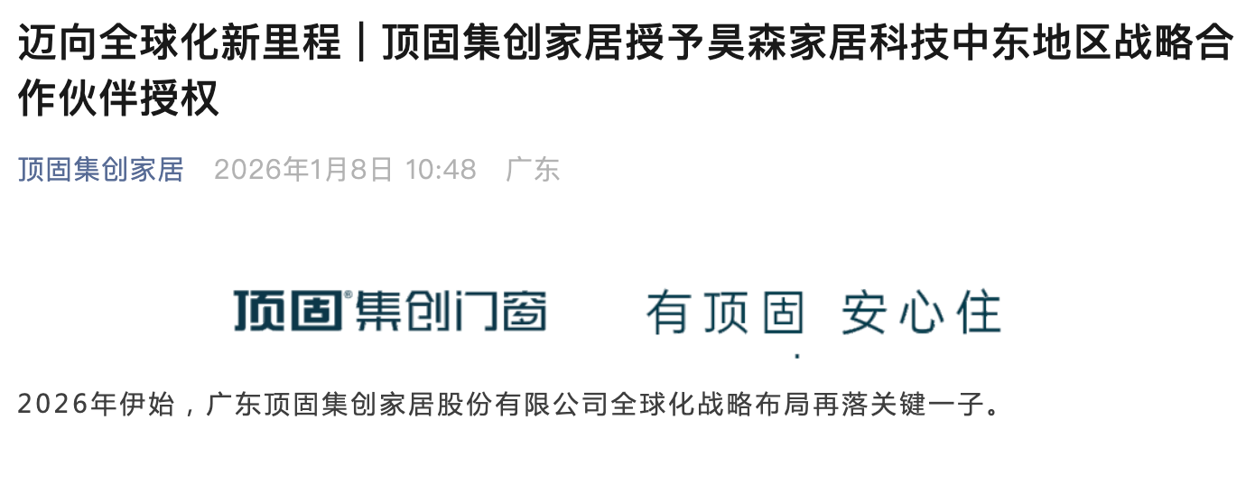 授权昊森家居自2026年起,成为顶固集创在中东地区的官方战略合作伙伴,共同推进顶固集创旗下全系列产品,包括顶固门窗、定制家居等,在该地区的市场深耕与品牌建设。