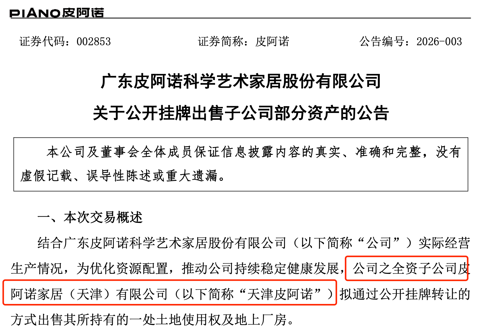 1月23日,皮阿诺(002853.SZ)公告宣布,旗下全资子公司皮阿诺家居(天津)有限公司(简称“天津皮阿诺”)计划通过公开挂牌方式,转让其位于天津市静海经济开发区的一处工厂资产。