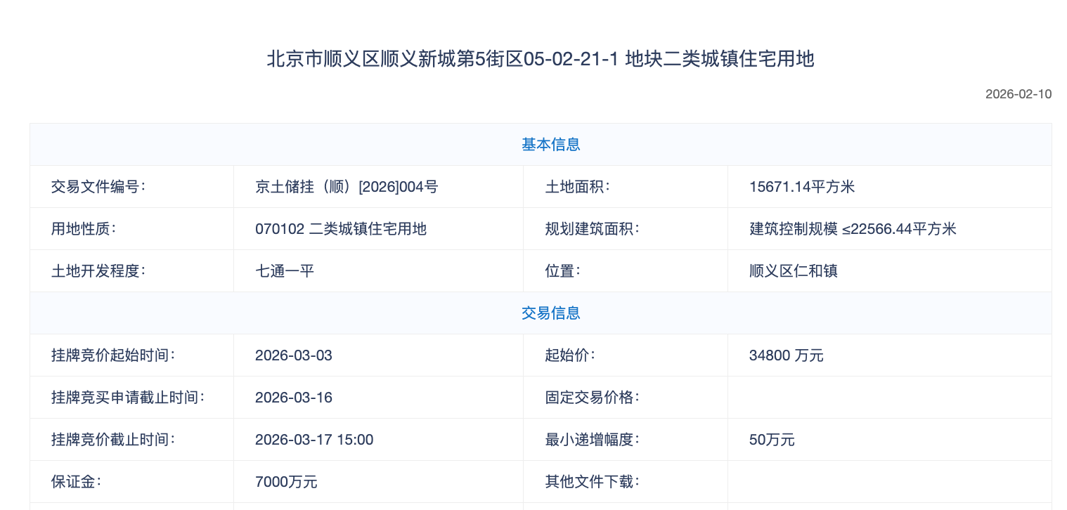 北京进深 徐迪2月10日,顺义新城第5街区05-02-21-1地块正式挂牌。
