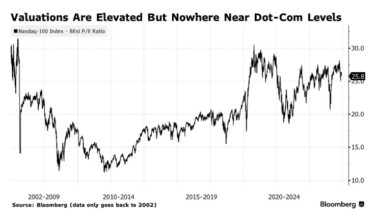 尽管科技巨头们估值偏高,但相较过去的市场狂热时期而言并未到“极端”的泡沫破裂情境。市场常拿它与2000年代的互联网泡沫对比,但AI带来的涨幅规模并不等同于互联网发展期。例如,BI统计数据显示,以科技股为主的纳斯达克100指数当前约为预期利润的26倍;而在互联网泡沫顶峰时该倍数曾超过惊人的80倍。