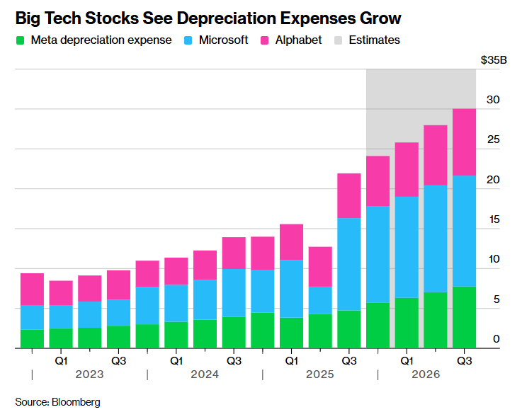 数据中心“狂建浪潮”带来的折旧费用上升也是市场重要担忧。谷歌母公司Alphabet、微软、Meta在2023年第四季度合计折旧约100亿美元;到刚在9月结束的季度,该数字接近220亿美元;华尔街预计到明年此时约为300亿美元。上图显示,科技巨头们折旧费用攀升。