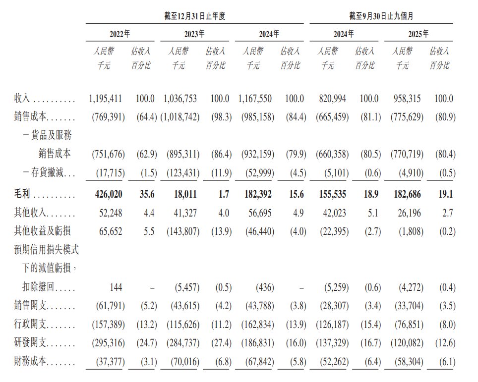 于2022年度、2023年度、2024年度、2025年截至9月30日止九个月,公司分别录得毛利约4.26亿元、1801.1万元、1.82亿元、1.83亿元。