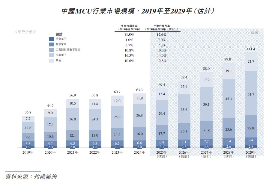 中国MCU芯片市场经历了快速的发展,从2019年的人民币368亿元规模快速提升至2024年的人民币633亿元规模,年复合增长率达11.5%。且该市场预计在未来将依然保持快速增长,预计将以12.0%的年复合增长率增长至2029年的人民币1,114亿元规模。