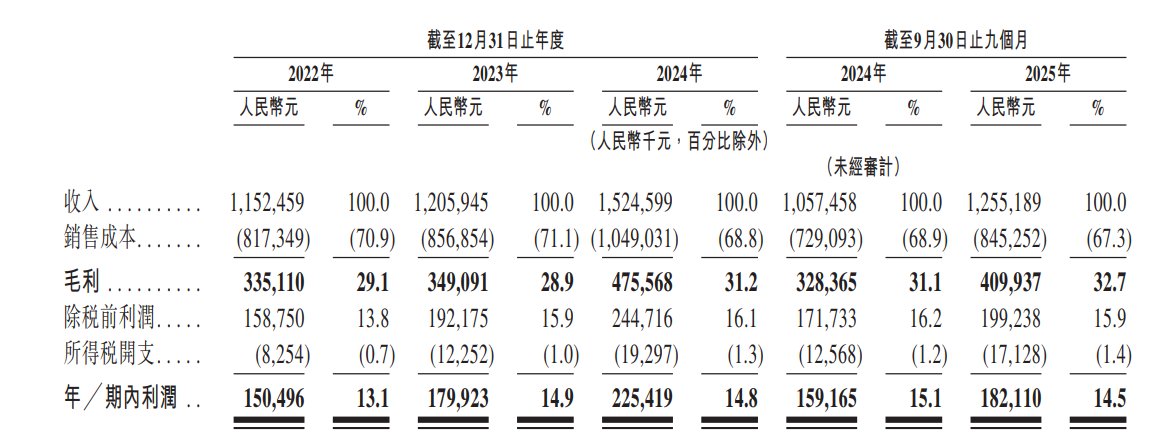 财务方面,于2022年度、2023年度、2024年度、2024年以及2025年截至9月30日止九个月,兆威机电收入分别约为11.52亿元、12.06亿元、15.25亿元、10.57亿元、12.55亿元人民币;同期,年内/期内利润分别约为1.50亿元、1.80亿元、2.25亿元、1.59亿元、1.82亿元人民币。