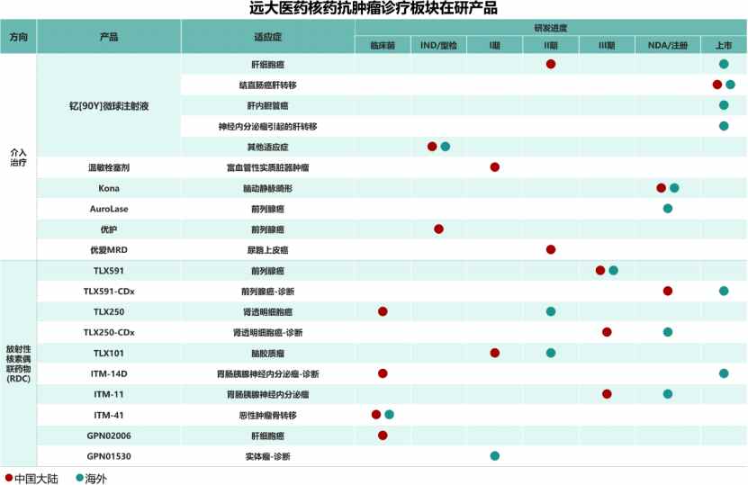 产品方面,围绕肿瘤诊疗一体化的治疗理念,公司在研发注册阶段已储备16款创新产品,涵盖68Ga、177Lu、131I、90Y、89Zr在内的5种放射性核素,覆盖了肝癌、前列腺癌、脑癌等在内的7个癌种;在早期研发阶段,以RDC药物为主,产品储备达10余款,产品种类涵盖诊断和治疗两类核素药物,为患者提供多适应症治疗选择、多手段且诊疗一体化的全球领先的抗肿瘤方案。