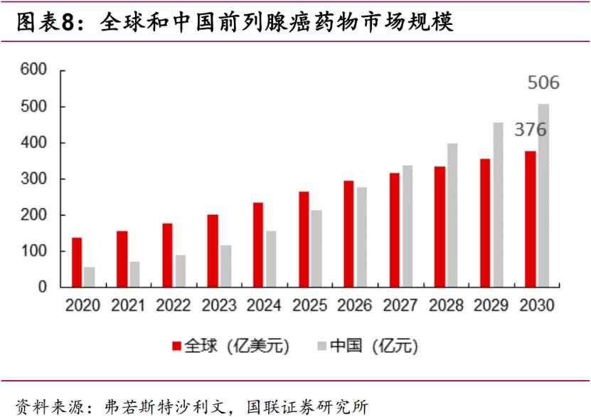 前列腺癌是我国男性群体中常见的癌症类型之一,且其发病率和病死率正随着人口老龄化加剧等因素呈明显升高趋势。根据弗若斯特沙利文数据,预计2025年我国前列腺癌患者数约为108万人,预计前列腺癌药物市场规模将于2030年增长至近506亿元人民币,而同期全球市场规模则将达约376亿美元。