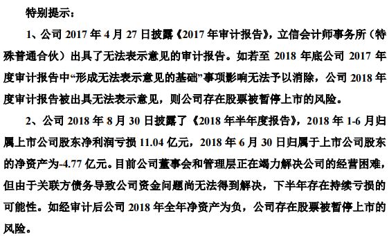 就这两则消息,都有巨大不确定性。另外,公司2018年8月30日披露了《2018 年半年度报告》,2018年1-6月归属上市公司股东净利润亏损11.04亿元人民币,2018年6月30日归属于上市公司股东的净资产为-4.77亿元人民币。如果下半年公司继续亏损且经审计后2018年全年净资产为负,公司的股票则会被暂停上市。尽管公司已经处于资不抵债的情况,但仍然不能阻挡公司股价的上涨。