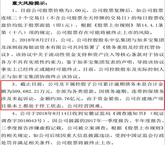 那么,这家公司是基本面向好催生股价上涨的吗?财华社查看中弘股份的公告和报表之后发现,公司及下属控股子公司累计逾期债务本息合计金额为509,682.21万元人民币,全部为各类借款。因债务逾期、连带担保债务涉及多起诉讼,金额约30.76亿元人民币。由于资金紧张,公司在建地产项目基本上都处于停工状态,公司经营困难。