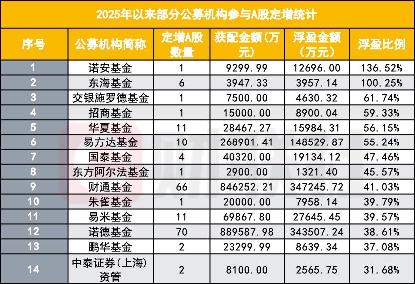 在这轮定增潮中,诺德基金与财通基金无疑是最具代表性的两家主力军。截至目前,诺德基金共参与了70只个股的定增,获配金额达88.96亿元,浮盈比例为38.61%。财通基金则以66只个股、84.63亿元获配紧随其后,浮盈比例达到41.03%。这两家机构不仅在数量上遥遥领先,也通过规模化参与形成了良好的收益回报。