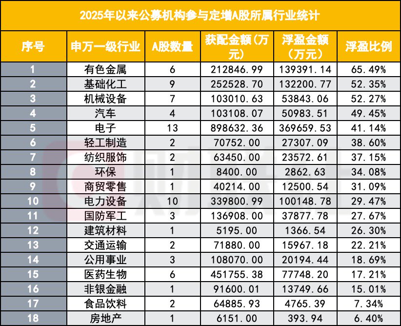 若按浮盈比例划分,有色金属行业拔得头筹,6只定增个股合计浮盈比例高达65.49%。基础化工和机械设备紧随其后,浮盈比例分别为52.35%和52.27%。这三大行业的共同特点在于周期属性较强,估值处于相对低位,叠加供需格局改善,成为资金眼中的“估值洼地”。