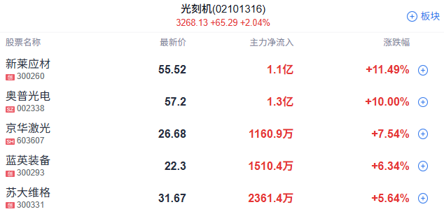 光刻机概念异动拉升,凯美特气、奥普光电涨停,新莱应材、蓝英装备、波长光电、京华激光等冲高
