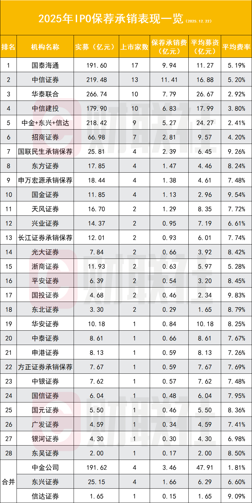 IPO保荐承销实际募资TOP10分别为华泰联合(266.74亿元)、中信证券(219.48亿元)、“中金+东兴+信达”(218.42亿元)、国泰海通(191.6亿元)、中信建投(179.9亿元)、招商证券(66.98亿元)、国联民生承销保荐(25.81亿元)、申万宏源承销保荐(18.44亿元)、东方证券(17.85亿元)、天风证券(16.7亿元)。