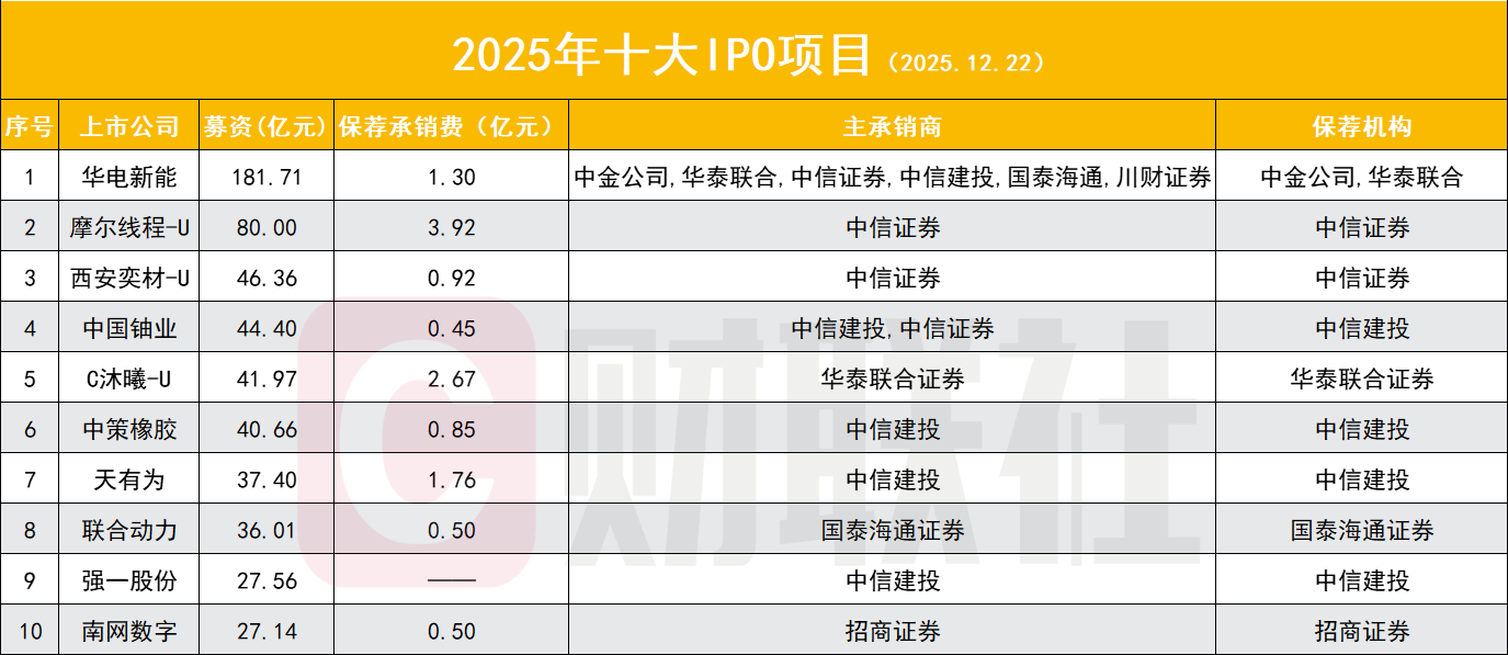 年内IPO募资额最大的上市项目是华电新能,募资总额达181.71亿元,保荐承销费达1.3亿元,该项目由中金公司、华泰联合共同保荐,主承销商多达6家,分别是中金公司、华泰联合、中信证券、中信建投、国泰海通、川财证券。