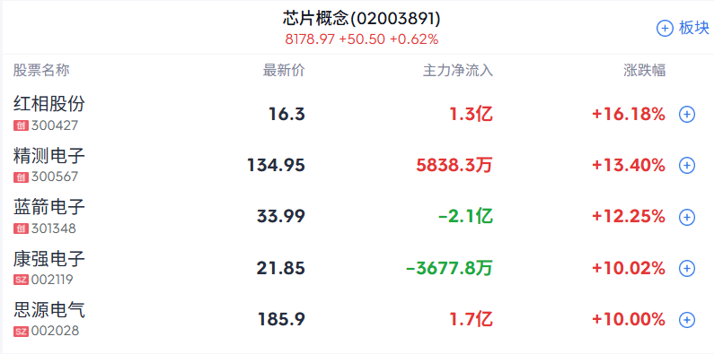 芯片股早盘继续走强,天岳先进拉升涨超12%,彤程新材、三孚股份、利扬芯片、恒坤新材、精测电子等涨超7%。