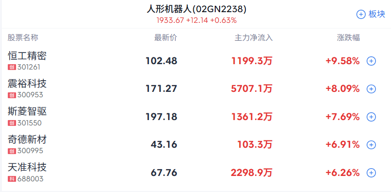 人形机器人概念表现活跃,斯菱智驱涨超13%,恒辉安防20cm涨停,三花智控、力星股份、震裕科技、埃夫特、浙江荣泰、万向钱潮跟涨。