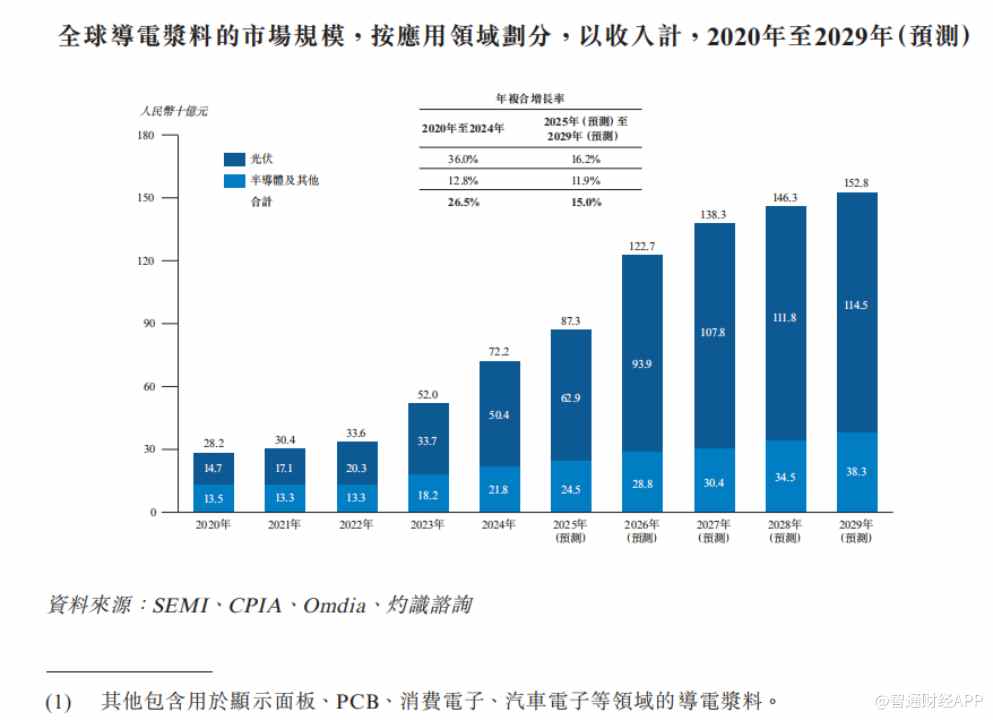 从行业空间来看,全球光伏导电浆料市场仍具备稳健增长潜力。灼识咨询报告显示,全球光伏导电浆料市场规模已从2020年的147亿元(人民币,下同)增长至2024年的504亿元,预计2029年将进一步增至1145亿元,2025-2029年复合年均增长率达16.2%。其中,海外市场随着光伏产能向东南亚、中东、印度等地区扩张,成为重要增长增量,2024年市场规模达39亿元,预计2029年将增至174亿元,复合年均增长率高达36.3%,这为聚和材料的全球化拓展提供了广阔空间。