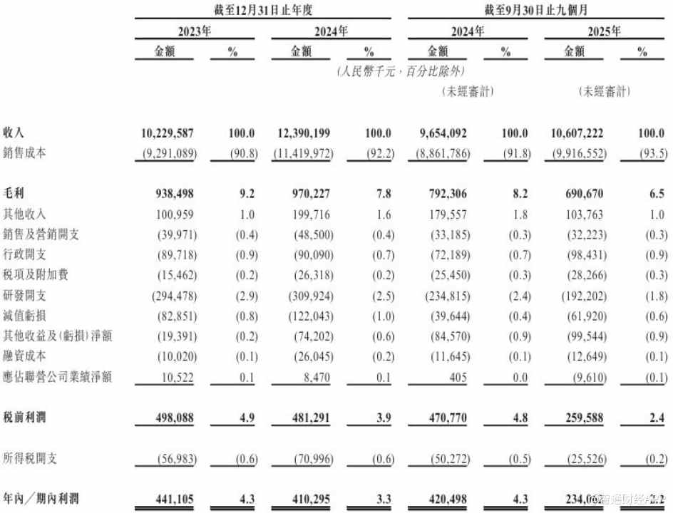 盈利层面则呈现逐步承压的态势。同期公司毛利率分别为9.2%、7.8%、6.5%,净利率从2023年的4.3%降至2025年前九月的2.2%,2025年前九月期内利润2.34亿元,较上年同期的4.2亿元下降44%。