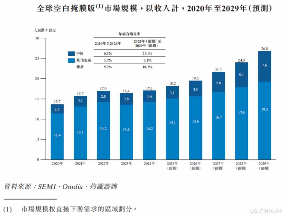 招股书显示,光掩膜版是光刻工艺的核心材料,占半导体材料成本的13%,是仅次于硅片和电子特气的第三大半导体材料。而在光掩膜版的制造流程中,空白掩膜版作为产业链上游基石,不仅价值量最集中,更具备极高的技术壁垒,其基板平整度、膜层均匀性及表面缺陷密度等关键指标,直接决定了下游光刻图形转移的精度,进而影响芯片制程良率与性能。从市场空间来看,中国空白掩膜版市场规模2024年达29亿元,预计2029年将增至76亿元,2025-2029年复合年均增长率达25.1%。