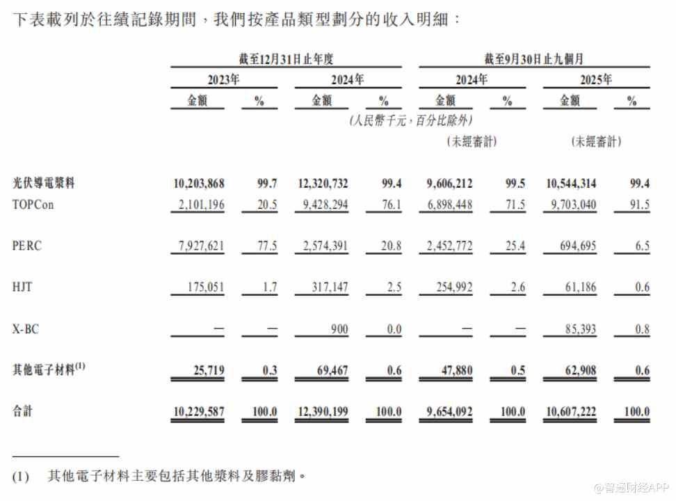 招股书显示,聚和材料成立于2015年,是一家由研发驱动的先进材料公司,公司的产品主要包括光伏导电材料和其他电子材料。在光伏导电浆料领域,聚和材料构建了覆盖TOPCon、PERC、HJT及X-BC等全主流路线的产品矩阵。在当前N型电池成为市场主流的背景下,公司产品结构与行业趋势高度契合。2025年前九月,公司TOPCon系列浆料收入占比已达91.5%。据灼识咨询数据,截至2025年9月30日止九个月,公司光伏导电浆料销售收入在全球所有制造商中排名第一,市场份额27%。