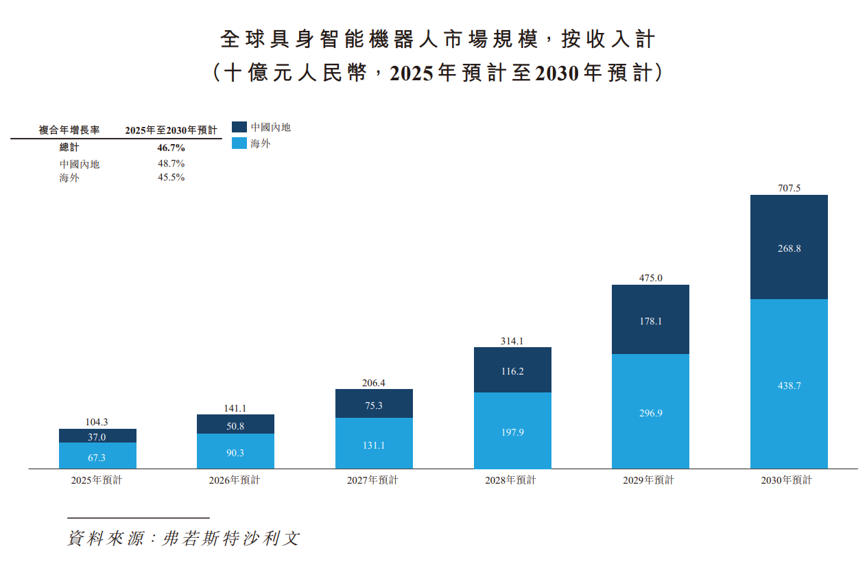 随着大模型与具身智能技术的深度融合以及核心技术的突破,具身智能机器人的感知、决策和执行能力已得到显著提升。具身智能市场正逐渐走向大规模商业化应用阶段。在技术成熟度提高和应用成本降低的驱动下,具身智能机器人正加速从工业领域拓展至包括商业服务、医疗健康等更广泛的场景,推动全球具身智能机器人市场快速增长。全球具身智能机器人市场规模预计将从2025年的人民币1,043亿元进一步增长至2030年的人民币7,075亿元,2025年至2030年期间的年复合增长率为46.7%。其中,中国内地具身智能机器人市场规模预计将于2030年达到人民币2,688亿元,占全球市场的38.0%,2025年至2030年的年复合增长率为48.7%。