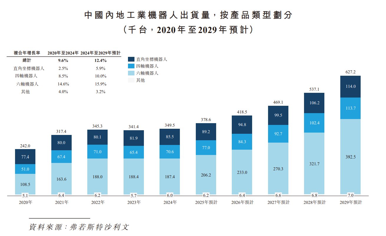 中国内地工业机器人的出货量从2020年的24.20万台增长至2024年的34.95万台,2020年至2024年期间的年复合增长率为9.6%。未来,中国内地工业机器人出货量预计将进一步增长至2029年的62.72万台,2024年至2029年期间的年复合增长率达到12.4%。
