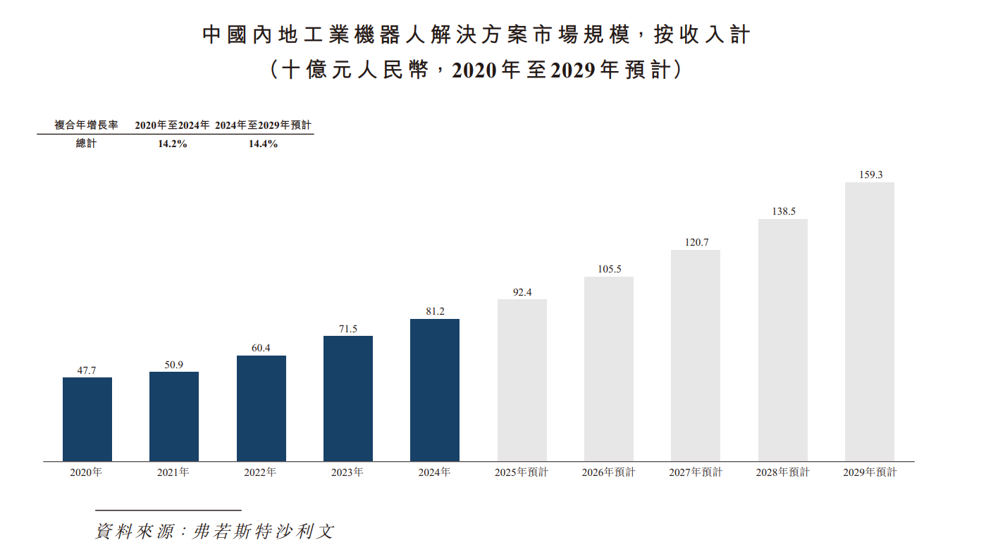 中国内地工业机器人解决方案的市场规模从2020年的477亿元增长至2024年的812亿元,2020年至2024年期间的年复合增长率为14.2%。未来,市场规模预计将进一步增长至2029年的1,593亿元,2024年至2029年期间的年复合增长率达到14.4%。