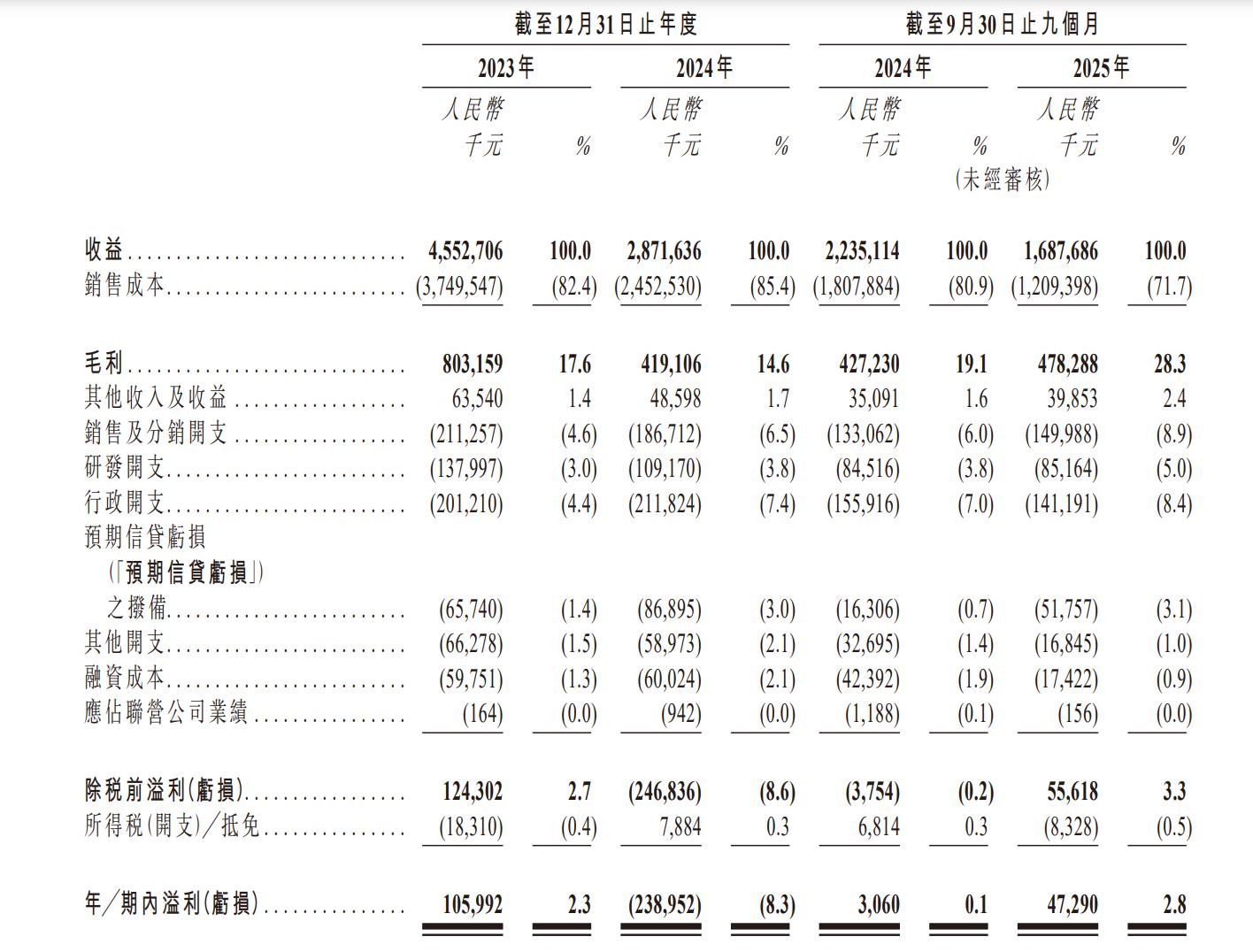 公司于2023年、2024年、2025年截至9月30日止九个月,收益分别约为45.53亿元、28.72亿元、16.88亿元民币。