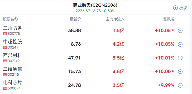 商业航天概念震荡回升,电科芯片直线涨停,西部材料触及涨停,欧科亿、再升科技、广联航空、飞沃科技等冲高。