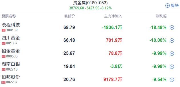 贵金属概念集体回调,中金黄金、白银有色、豫光金铅、招金黄金、四川黄金、湖南白银等多股跌停。