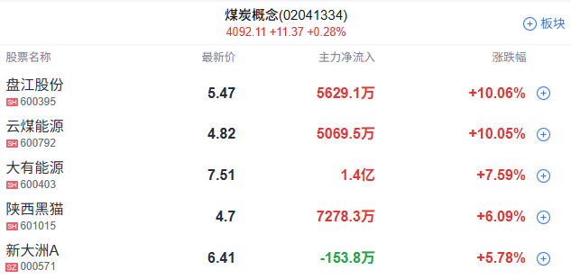煤炭板块逆势走强,盘江股份一字涨停,新大洲A、大有能源、恒源煤电、潞安环能、山西焦煤跟涨。
