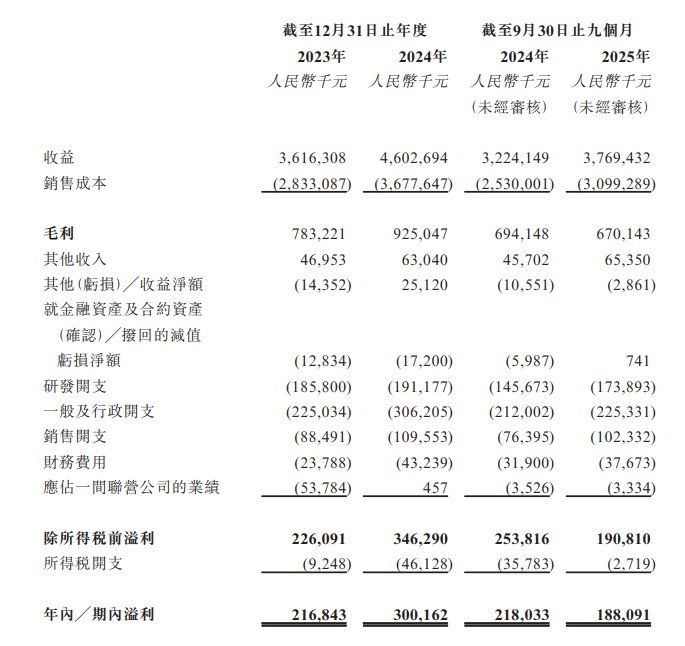 于2023年度、2024年度、2025年截至9月30日止九个月,公司分别录得年内╱期内溢利约为人民币2.17亿元、3亿元、1.88亿元。