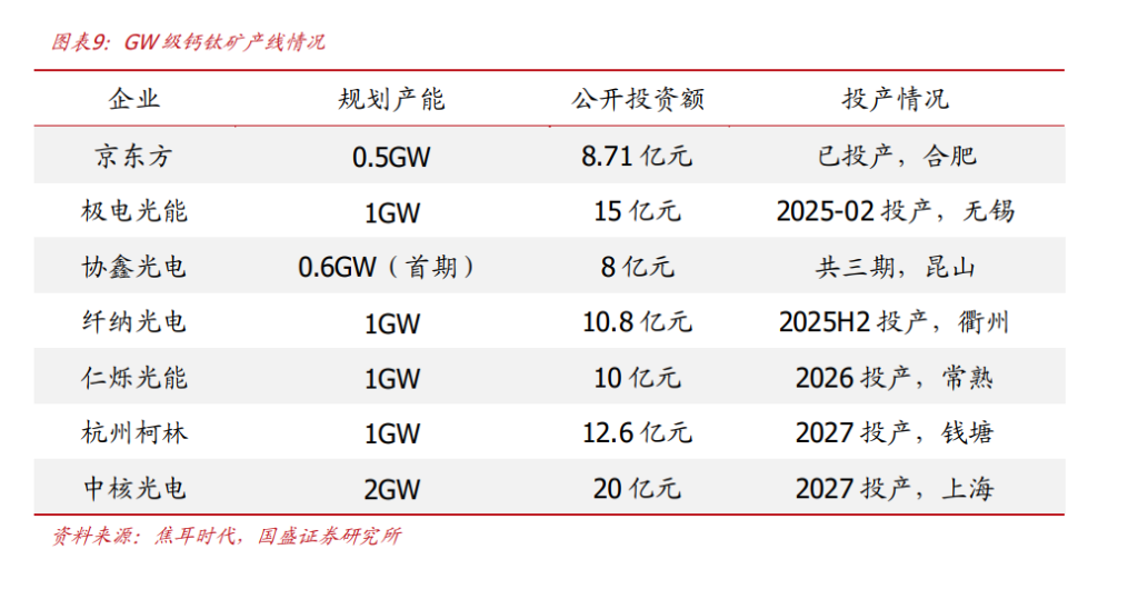 2025年(元年): 极电光能全球首条GW级产线2月投产;协鑫光电GW级产线6月投产;纤纳光电1GW产线预计下半年投产。