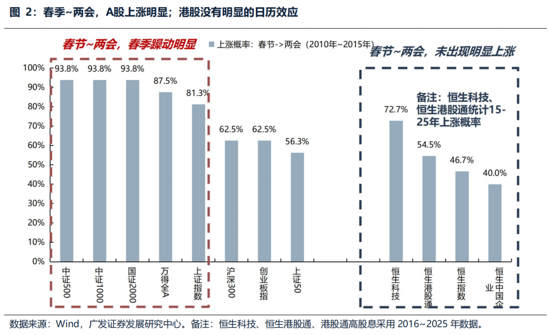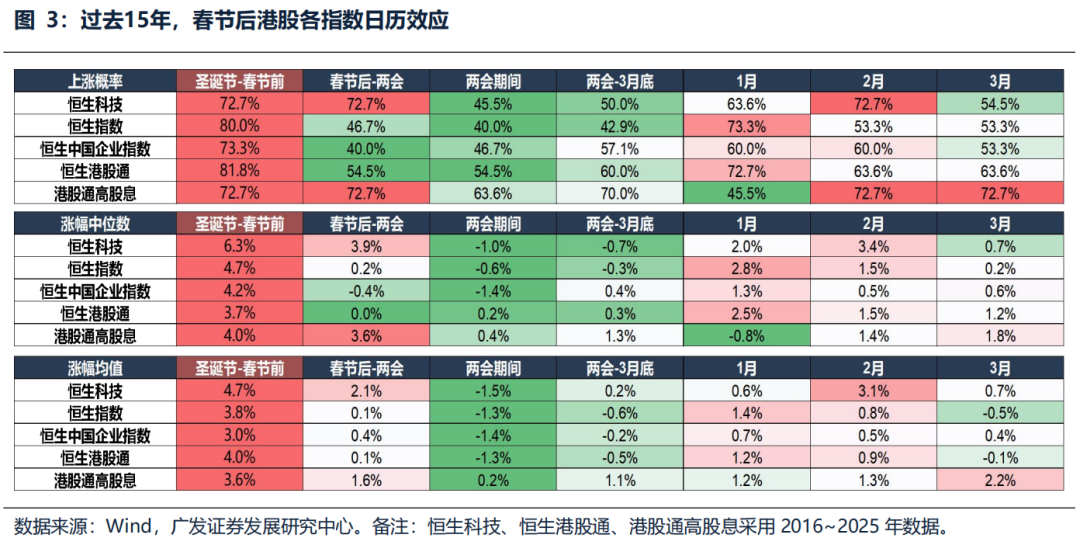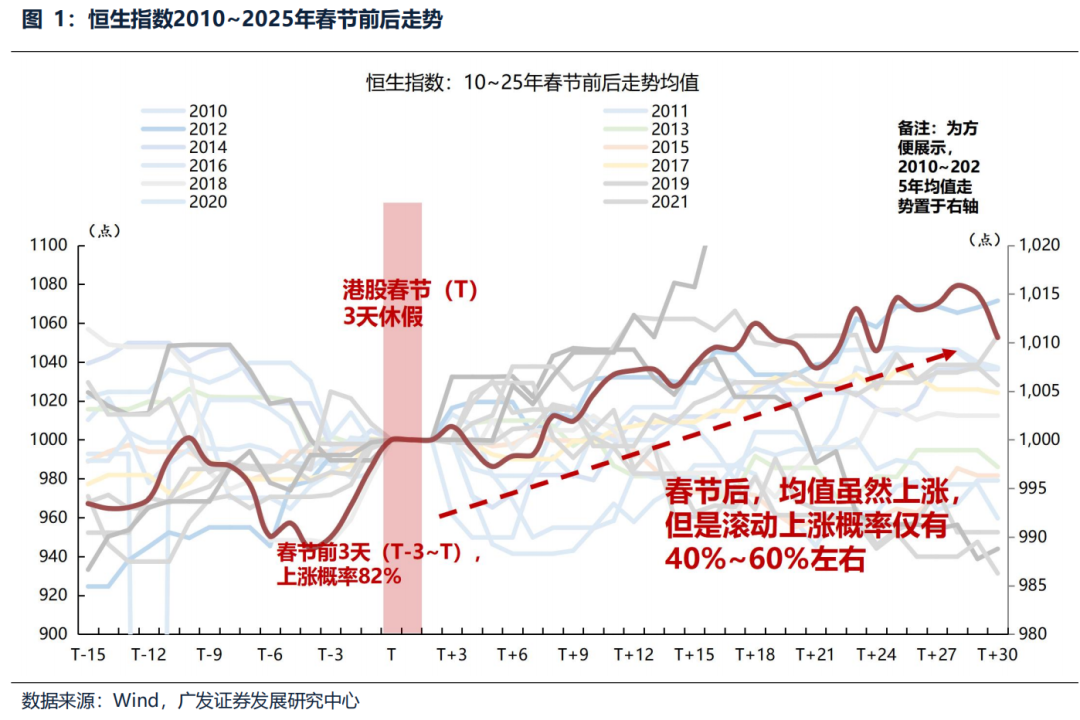 广发证券发布研报称,回看历史经验,恒生指数在春节前3个交易日上涨概率82%,节后并没有明显的日历效应,上涨概率仅在40%~60%,春节后-两会的典型窗口并不天然适配港股。但这次也可能不一样,港股近年来的定价逻辑正在发生变化,港股与A股的相关性走强,与美股的相关性走弱。这意味着在内地市场风险偏好明显抬升的背景下,港股存在一定的“被动跟随”上涨的可能性,例如24、25年的春节后。