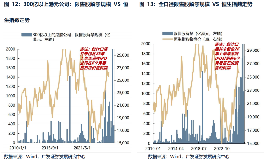 (4)港股天量IPO对市场影响不大,影响主要在于IPO过后6个月的解禁高峰。典型的例如11年年中、15年下半年、19年3月、21年二季度、22年年中,解禁潮都与港股下跌出现在相似时间段。26年3月主要是有色金属(紫金黄金国际、南山铝业国际)+茶饮的解禁潮,中大型规模公司的解禁规模872亿港元,高于去年年末的解禁小高峰。由于港股通账户并不能够参与打新,享受稀缺性公司的上市红利,却需要承受限售股解禁带来的风险,这可能确实是南向资金对于2026年港股的主要担忧之一。