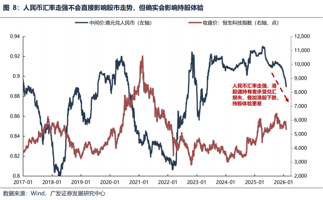 (2)人民币兑港元汇率的走强,虽不会影响港股走势,但兑汇损失影响下,确实导致持股体验更差,但人民币不具备长期大幅单边升值基础。