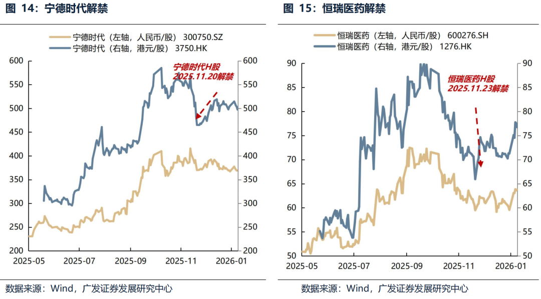 展望:市场情绪消化中孕育布局机会,关注节后解禁高峰带来潜在拐点。在情绪低点分批布局(1)受益于AI产业趋势的科技龙头,例如互联网;(2)估值已消化且基本面稳健的高股息标的;(3)解禁压力释放后可能出现反弹的优质公司。例如,宁德时代等股份在2025年11月中下旬解禁前一周,均因市场担忧流动性冲击而遭遇“抢跑式”大幅回调,风险被提前计入定价;而一旦解禁完成,利空出尽反而促使股价快速见底企稳甚至回升。