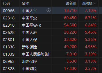 保险股午后走强,中国太平涨超7%。国家金融监督管理总局发布通知,下调保险公司相关业务风险因子,下调风险因子意味着保险公司的资本使用效率可以得到提高。分析认为风险因子的降低,意味着保险公司可以将更多资金投入资本市场,为险资入市进一步打开空间。