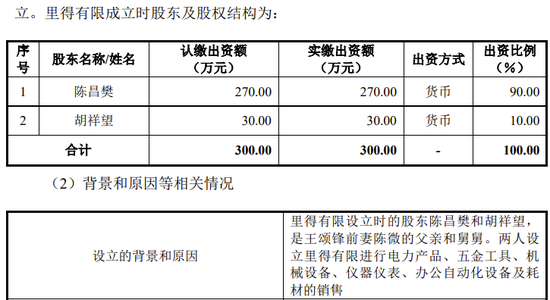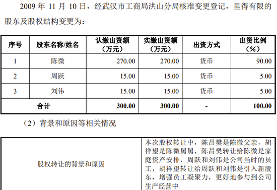 公司前身有限公司成立于2007年7月30日,注册资本300万元,股东为陈昌樊、胡祥望,各持股90%、10%。其中陈昌樊系陈微之父、胡祥望为陈微的舅舅。