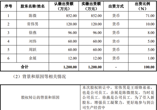 2011年1月,陈微将部分股权转让给王颂锋的弟弟、公司员工常伟男,将部分股权转让给朋友兼员工余展、员工徐燕。陈微持股比例下降至71%。