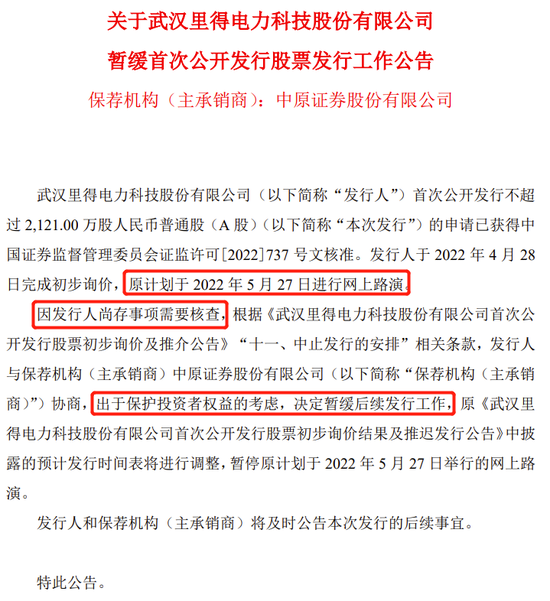里得电科2022年4月26日发布招股公告,证券代码001235。2022年4月28日完成初步询价,5月6日发布招股说明书,5月26日发布暂缓发行公告。原计划5月27日进行网上路演。决定暂缓后续发行工作的原因是:发行人尚存事项需要核查。