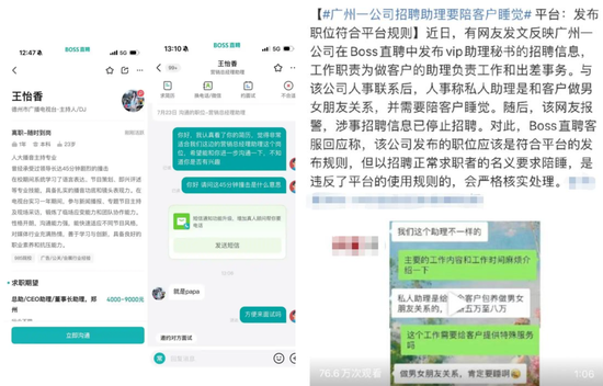 2022年8月,又有媒体曝光,广州某公司在平台上发布名为“VIP助理秘书”的岗位,表面职责为处理客户事务与出差安排,但求职者通过微信与招聘方联系后,对方却明确表示,该工作的实质是让求职者与客户建立男女朋友关系,甚至需“陪睡”。