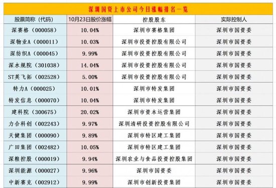 在这样的大背景下,周四A股市场开盘后,深圳国资上市公司旋即吹响了涨停集结号,深赛格(000058)、深物业A(000011)、深纺织A(000045)、特力A(000025)、特发信息(000070)、建科院(300675)、力合科创(002243)、天健集团(000090)、深粮控股(000019)、深圳能源(000027)、中新赛克(002912)、广田集团(002482)、ST英飞拓(002528)等10余只深圳国资上市公司的股价纷纷封于涨停。
