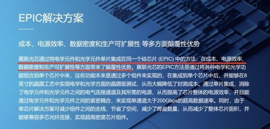 熹联光芯通过将电学元件和光学元件单片集成在同一个硅芯片 (EPIC) 中的方法,在成本、电源效率、数据密度和生产可扩展性等方面带来了颠覆性优势。熹联光芯的EPIC方法是通过将各种电学和光学功能组合到单个芯片中来,这些功能本来是通过多个组件来实现的,在集成到单个芯片中后,并能够在8英寸的晶圆工艺中实现电学和光学方面的晶圆级测试,从而大幅降低了封测成本。通过单片集成,消除了电学元件和光学元件之间的电气连接通道及其所需的电源,从而提高了芯片整体的电源效率,并且能通过电学元件和光学元件之间的紧密耦合,来实现单通道大于200Gbps的超高数据速率。同时,由于单芯片解决方案可减少组件之间的走线,节省了空间,减少了焊盘数量,从而减少了整体芯片面积,并能够兼容多芯光纤连接,实现超高密度芯片组件。